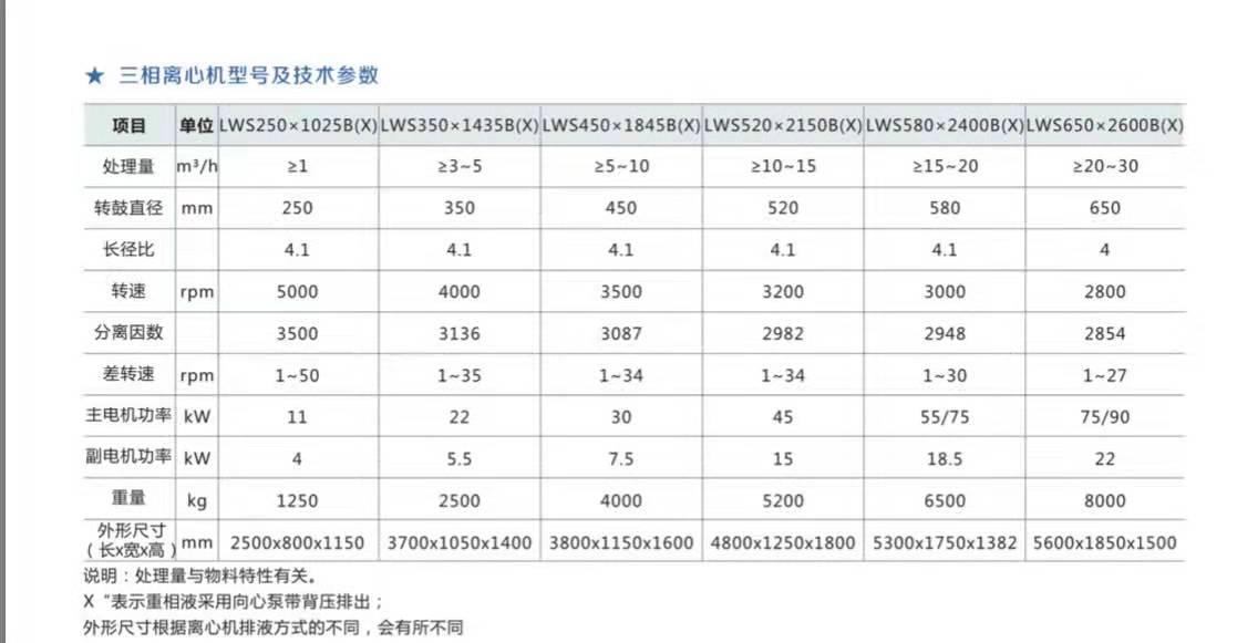 三相分离卧式螺旋卸料沉降离心机工作原理基本同普通卧式螺旋卸料沉降离心机相似。两种固体和一种液体进入离心机后,利用固—液—固比重差,并利用离心力场使之扩大几千倍,重固相在离心力的作用下被沉降,液相也出现分层,轻固上浮,从而实现固—液—固三相分离,并在特殊机构的作用下分别排出机体。整个进料过程和分离过程是连续。密封,自动完成。